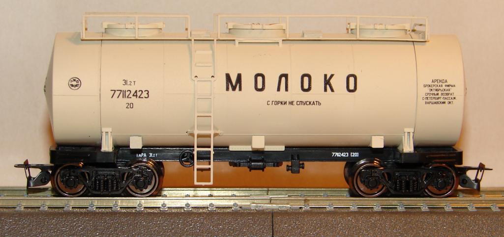 Разновидности: одна разновидность Эпоха: IV Принадлежность: СЖД Фирма-производитель: Пересвет Год начала производства: 2020 Артикул: 3740, 3741, 3742 Описание моделиСерийная модель молочной цистерны была впервые заявлена к производству в каталоге фирмы "Пересвет" 2016-2017 гг. В марте 2017 г., на традиционной выставке в Центральном музее ж.д. транспорта (Санкт-Петербург), был представлен предварительный образец модели - неокрашенный корпус без накладных деталей. Готовая модель появилась в октябре 2020 г. В сентябре 2025 г. Пересвет выпустил модель цистерны-термоса для перевозки молока в окраске РЖД пятой модельной эпохи. Модель отличается от предыдущих версий соответствующими надписями и торцами котла конической формы. Артикул модели - 3742. Модель создана на базе серийной модели цистерны-термоса, выпускающейся "Пересветом" с 2014 г. Новые детали молочной цистерны: дополнительные заливные горловины и элементы сливного оборудования; иная конфигурация трапиков. Другие модели цистерны для перевозки молока: - от В.Дерунова. Описание прототипаПеревозки молока и молочных продуктов имеют ряд особенностей, главная среди которых - ограниченный технологический срок перевозки (не более трех суток) при температурах молока зимой не ниже +2°С, а летом не выше +8...+10°C.Наличие у котла цистерны слоя тепловой изоляции превращает ее в огромный термос, длительное время сохраняющий температуру налитого молока как зимой, так и летом. Грузоподъёмность цистерны для перевозки молока (мод. 15-886) - 32.2 т.