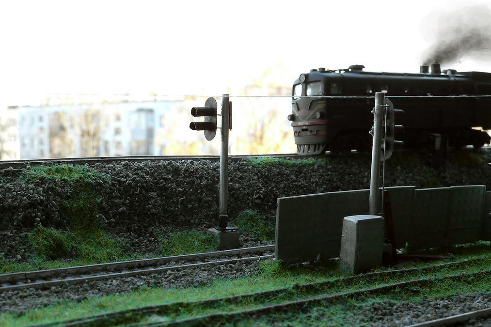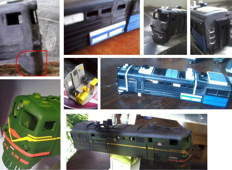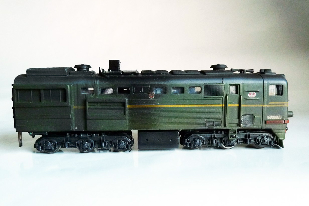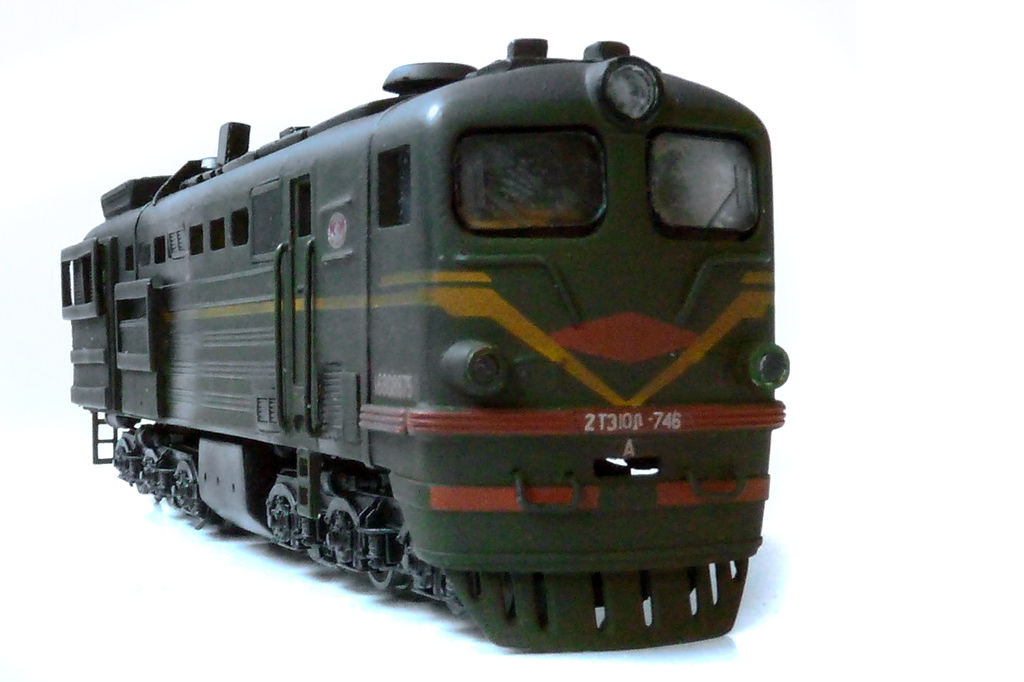 Разновидности: модель выполнена в единственном экземпляре Эпоха: IV Принадлежность: СЖД Фирма-производитель: Прийменко В. Год начала производства: 2013 Описание моделиМодель тепловоза 2ТЭ10Л-746 (одна секция) выполнена петербуржцем Вячеславом Прийменко. Это - первый опыт моделиста в изготовлении моделей подвижного состава. Использованы корпуса и ходовки серийных моделей тепловозов ТЭ3 и ТЭП10 производства фирмы "Пересвет"; отдельные детали выполнены самостоятельно с использованием миллимитрового ПВХ и проволоки. Представляет интерес оригинальная деталировка модели (маты для воздухозаборников, ступени и поручни, крышевое оборудование и пр.). Имеетися интерьер кабины машиниста, а также имитация дизеля. Установлено освещение. Другие модели тепловоза 2ТЭ10Л / ТЭП10Л: - от А.Ватаева; - от Дм.Попова ("ТТ-ТТ", малая серия); - от А.Ходакова; - от А.Шувикова; - от А.Зименкова; - от Д.Камушкина (малая серия). Описание прототипаГрузовой тепловоз серии 2ТЭ10Л был создан в 1961 г. на Луганском тепловозостроительном заводе как дальнейшее развитие тепловоза 2ТЭ10. Вместо кузовов несущей конструкции на нём были применены кузова с несущей рамой по принципу ТЭ3, с новой, характерной только для 21ТЭ10Л, формой кабины. Мощность дизелей составляла 2 х 3000 л.с.; проектная мощность локомотива составляла 1910 кВт, конструкционная скорость – 100 км/ч. Тепловозы 2ТЭ10Л изготавливались до 1977 г. включительно; за это время построено около трёх с половиной тысяч двухсекционных тепловозов этой серии. Их массовое списание началось в 1990-е гг., и сегодня 2ТЭ10Л остались на Российских железных дорогах в незначительном количестве. Тепловоз 2ТЭ10Л-2110 (настоящий номер 2100) экспонируется в музее Новосибирска; еще один 2ТЭ10Л-254 экспонируется в Ташкентском музее.