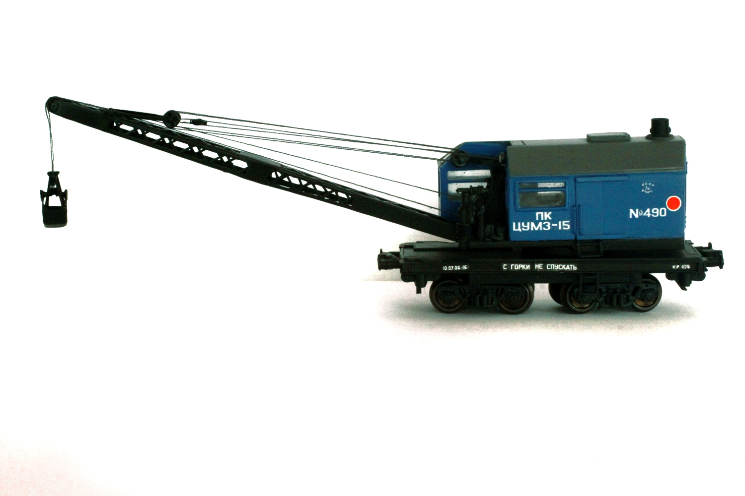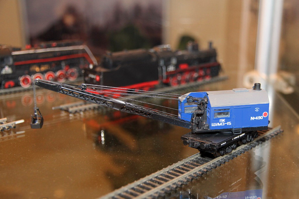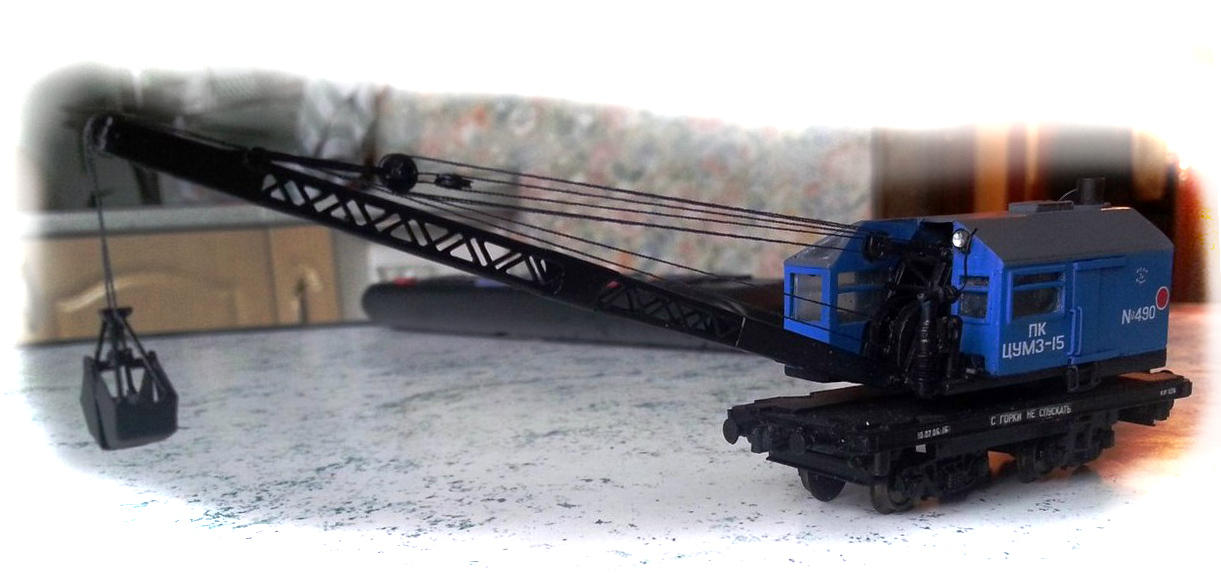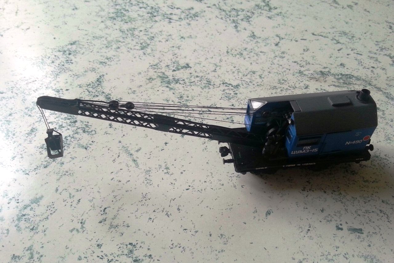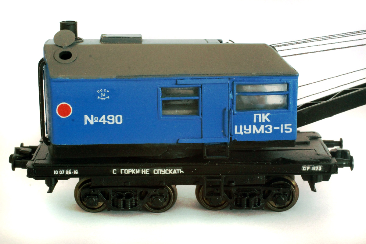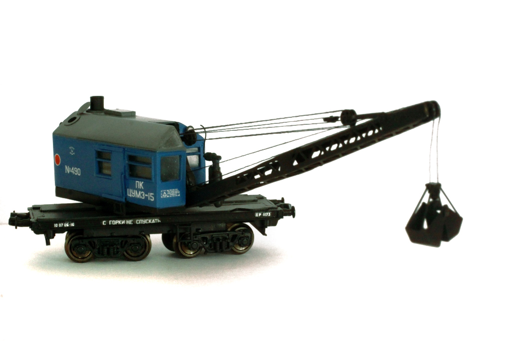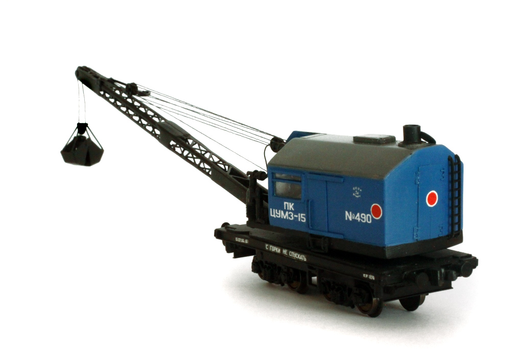 Эпоха: IV Принадлежность: СЖД Фирма-производитель: Братский С. Год начала производства: 2012 Описание моделиМодель парового ж.д. крана ПК ЦУМЗ-15 самостоятельно изготовлена московским моделистом С.В.Братским. (Использованы тележки ЦНИИ-Х30 пр-ва "Пересвет"). Модель впервые экспонировалась на выставке "Чугунка в моделях" в ноябре 2012 г. в московском Политехническом музее.В настоящее время модель находится в коллекции Сергея Животкова (Москва). Другие модели ж.д. крана ПК-ЦУМЗ-15: - от В.Прийменко. Описание прототипаСтреловой кран на ж.д. ходу с паровым приводом ПК ЦУМЗ-15 изготавливался заводом им. Первого Мая в г. Кирове и получил большое распространение на сети отечественных ж.д. Кран снабжен нормальной стрелой 12 м либо удлиненной стрелой 14 или 18 м (со вставками 2 или 6 м). Для подъема штучных грузов кран оборудуется грузовым крюком, а для подъёма сыпучихъ грузов - грейфером емк. 1,5 куб.м. Возможна комплектация крана грейфером большего объёма, а также специальным захватом для круглого леса. На наименьшем вылете стрелы кран обладает грузоподъемностью 15 т, а без вспомогательных опор - 10 т. Кран состоит из парового котла, двух одноцилиндровых паровых машин, ходовой и поворотной рамы, двух двухосных тележек, выдвижных опор, рельсовых захватов, передаточных меанизмов, а также рабочего оборудования: грузовой стрелы с траверсой, грузового крюка и грейфера. Для получения электроэнергии, чтобы освещать в ночное время место работы и кабину, кран оборудован турбогенератором. О.Долматов, "Локотранс".