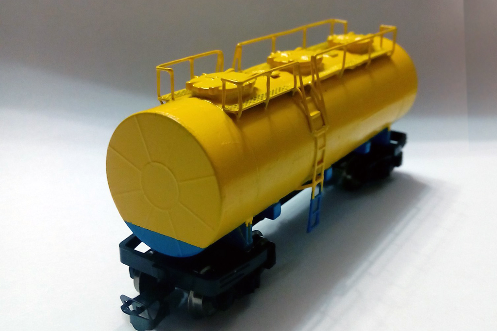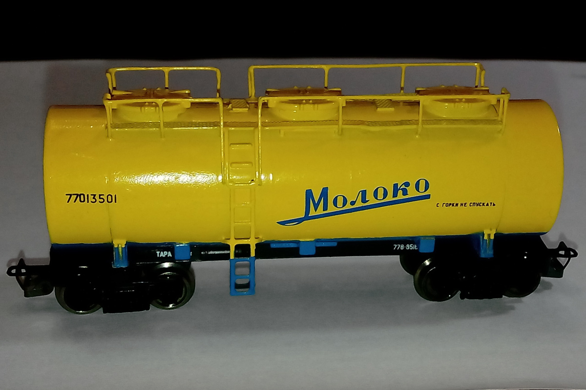 Разновидности: модель выполнена в одном экземпляре Эпоха: IV Принадлежность: СЖД Фирма-производитель: Дерунов В. Год начала производства: 2015 Описание моделиМодель 4-осной цистерны для перевозки молока выполнена петербургским моделистом Владимиром Деруновым. Использованы типовые комплектующие от серийной модели цистерны-термоса производства фирмы "Пересвет". Интересный факт. В 2016 или 2017 г. подобная модель ожидается как серийная в производственной программе фирмы "Пересвет". Другие модели цистерны для перевозки молока: - от фирмы "Пересвет" (серийная модель). Описание прототипаПеревозки молока и молочных продуктов имеют ряд особенностей, главная среди которых - ограниченный технологический срок перевозки (не более трех суток) при температурах молока зимой не ниже +2°С, а летом не выше +8...+10°C.Наличие у котла цистерны слоя тепловой изоляции превращает ее в огромный термос, длительное время сохраняющий температуру налитого молока как зимой, так и летом. Грузоподъёмность цистерны для перевозки молока (мод. 15-886) - 32.2 т.