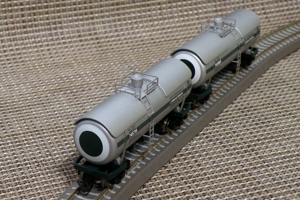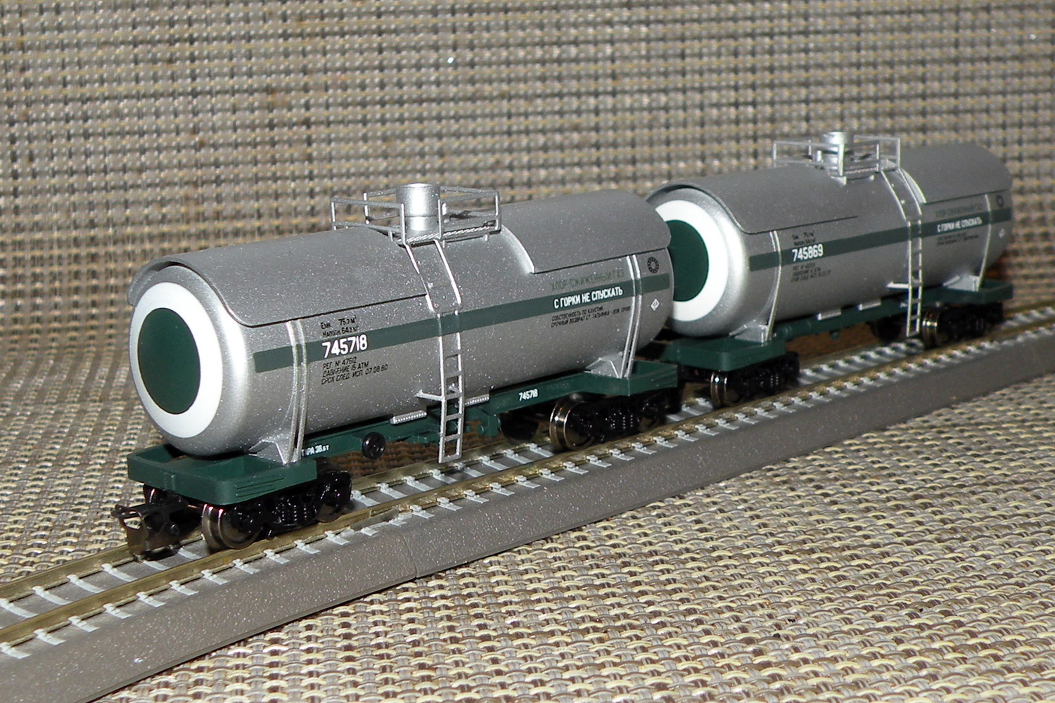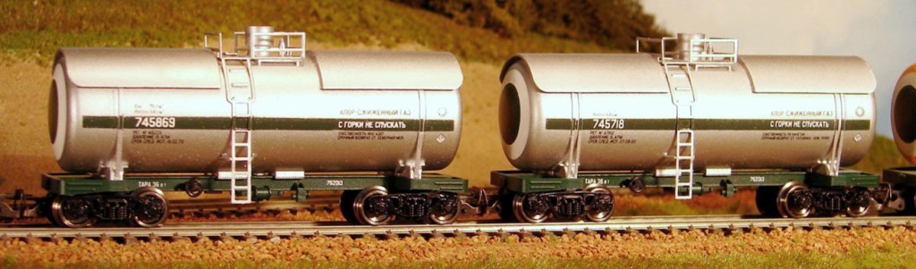 Эпоха: IV Принадлежность: пром. предприятие Фирма-производитель: Пересвет Год начала производства: 2015 Год окончания производства: Производится по настоящее время Артикул: 3705 Описание моделиС мае 2015 г. петербургской фирмой "Пересвет" серийно производится набор цистерн для перевозки хлора. На моделях установлена принципиально новая конструктивная деталь - экраны тепловой защиты. Основа модели - 4-осные цистерны отечественных железных дорог, производимые "Пересветом" с 2005 г. Заливное оборудование аналогично моделям цистерн для перевозки сжиженного газа. Цистерны, входящие в набор, отличаются бортовыми номерами, а также, традиционно - числом обручей.