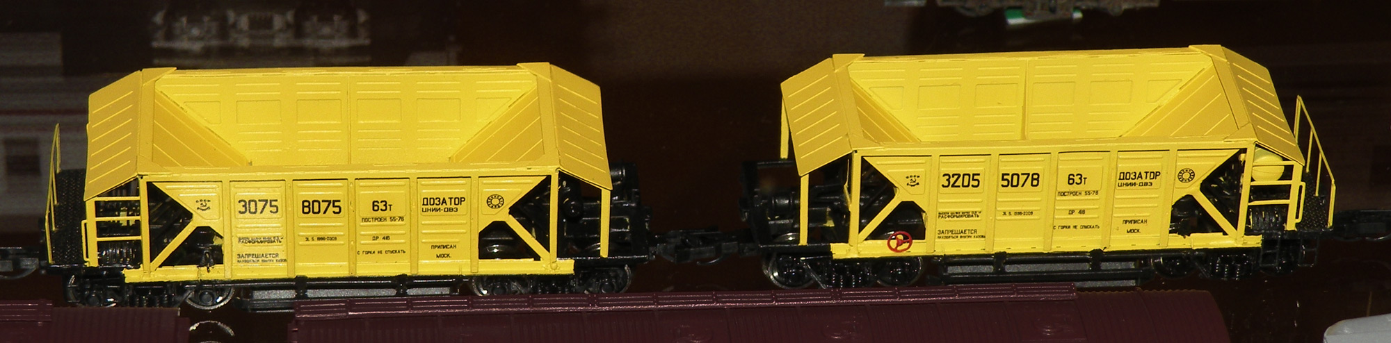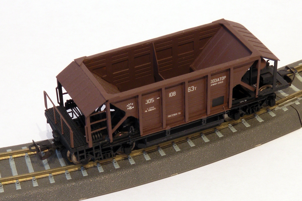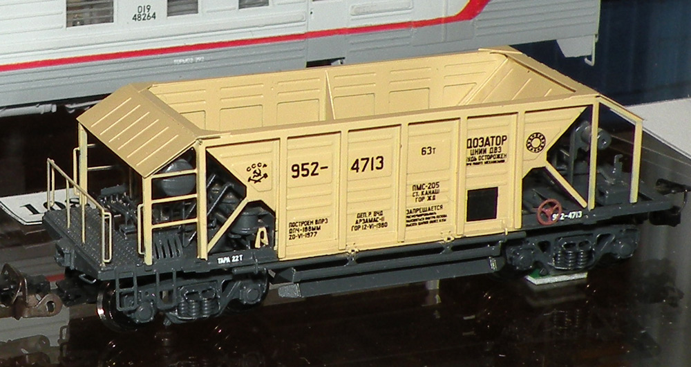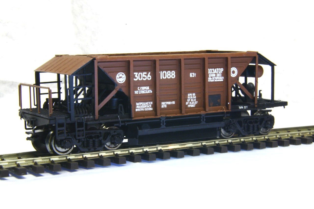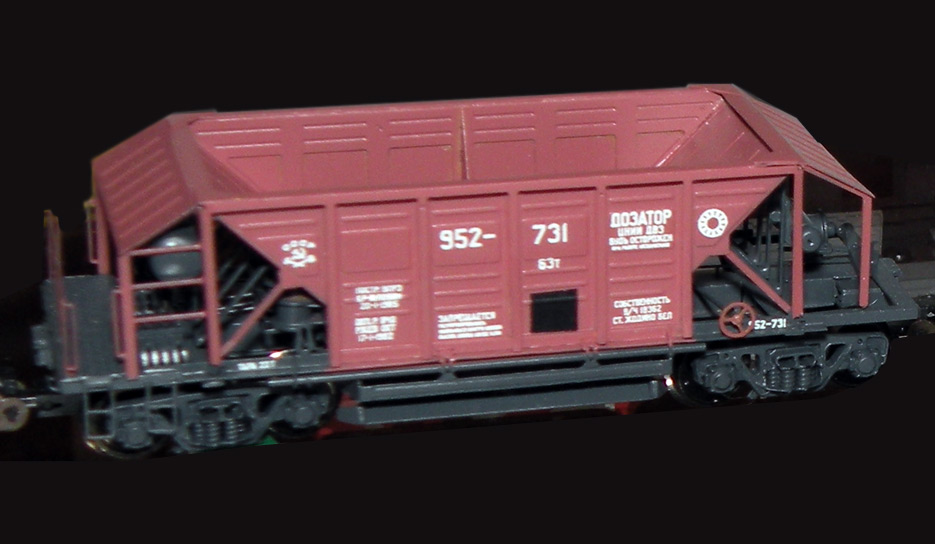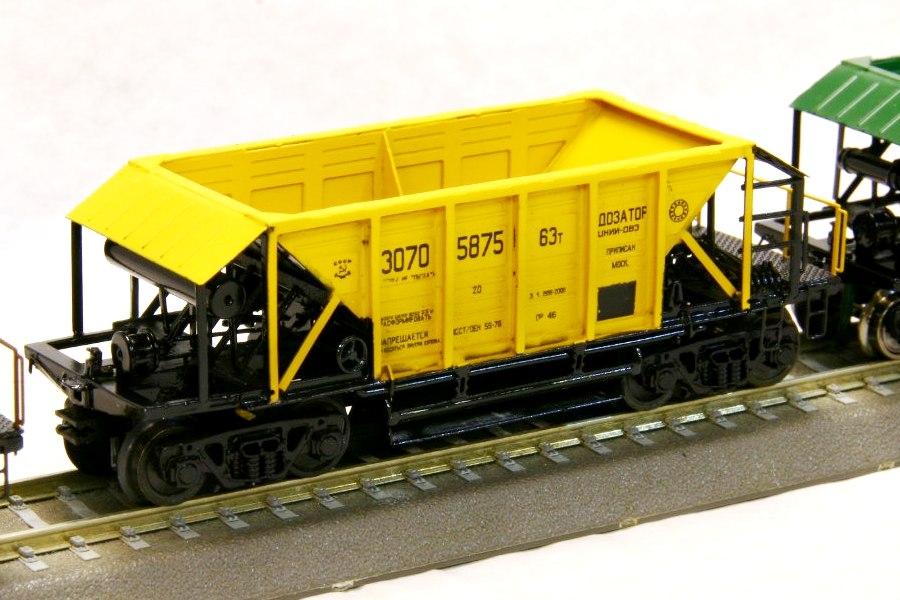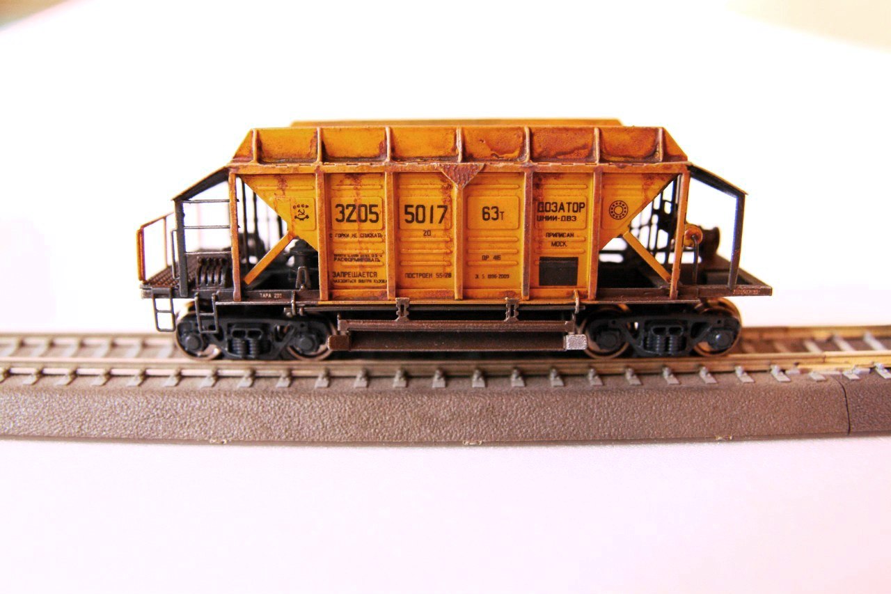 Разновидности: эпоха-принадлежность-окраска-номер (варианты под заказ); две конструктивные разновидности, различающиеся высотой бортов. Эпоха: III-V Принадлежность: СЖД, РЖД, пром. Фирма-производитель: Норкин-модель Год начала производства: 2010 Год окончания производства: производится по настоящее время Артикул: 2012 Описание моделиМодель хоппера-дозатора в виде "кита" из травлёной латуни появилась в ассортименте мануфактуры "Норкин-Модель" в конце 2009 г. В январе 2010 г. готовая модель (на тележках от "Пересвета") впервые экспонировалась на выставке в Раменском. Модель обладает высокой копийностью и деталировкой. В 2014 г. была представлена новая модель - хоппер-дозатор с увеличенной ёмкостю, отличающийся нарощенными бортами. Описание прототипаХоппер-дозатор в распространённой ярко-жёлтой окраске - экспонат Московского музея ж.д. техники (Рижский вокзал).