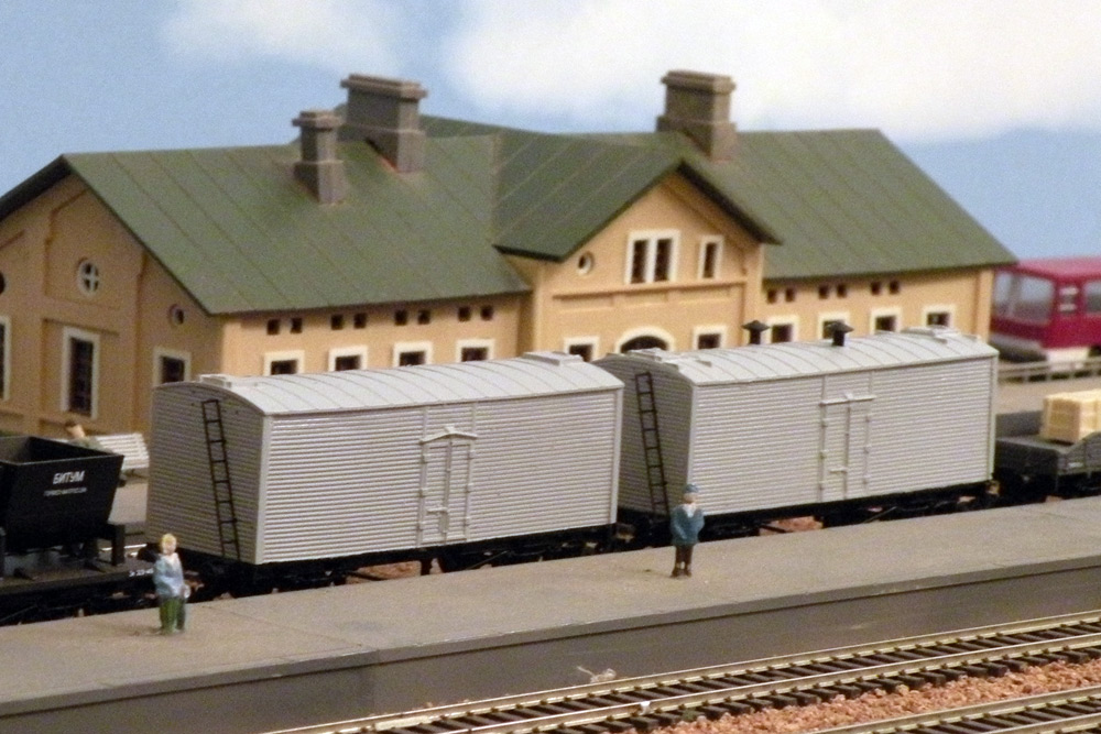 Разновидности: две конструктивные разновидности ледника; крытый на базе ледника; молочный вагон Эпоха: III Принадлежность: СЖД Фирма-производитель: Пересвет Год начала производства: 2012 Артикул: 3940, 3941, 3942, 3943 Описание моделиМодель двухосного вагона-ледника (на базе 2-осной платформы, модель которой производится "Пересветом" с 2009 г.) была впервые завялена в каталоге "Пересвет-2011-2012". На выставке "Железнодорожный моделизм-2011" в Петербурге были представлены два предсерийных образца с корпусами из эпоксидной смолы, отличающиеся формой дверей и деталями крыши. Впоследствии было решено делать модели по традиционной для "Пересвета" технологии, из пластика, и в середине 2012 г. появились: сначала модель вагона-ледника СЖД образца 1926 г. (арт. 3940), затем модель вагона-ледника образца 1932 г. (арт. 3941). Модели имеют травленые детали (лесенки, площадки, крышевые мостки) и выглядят презентабельно. С 2013 г. поизводятся ледник с надписями II модельной эпохи (в наборе с двумя другими моделями, арт. 3900), а также крытый вагон, переделанный из ледника (арт. 3942). Летом 2014 появилась ещё одна модель - молочный вагон белого цвета и с дополнительной трубой на крыше (III эп., арт. 3943). В обозримой перспективе возможно появление модели служебного вагона, переделанного из ледника. Другие модели 2-осных вагонов-ледников: - от А.Мурашова; - от И.Сергеева. Описание прототипаДвухосные ледники, строились в СССР в 20-х - 30-х гг. Тамбовским ВРЗ. Первый выпуск ("образца 1926 г."): вагоны изготавливались на базе рам двухосных (длиной 30 футов) платформ, постройки дореволюционных и первых послереволюционных лет. Второй выпуск ("образца 1932 г."): вагоны строились на специально спроектированной для них раме, но в тех же габаритных размерах. Вагоны имели незначительные конструктивные различия, что отражено в моделях. Охлаждение перевозимых продуктов осуществлялось за счет льда, загружаемого в специальные пристенные карманы через люки в крыше. Вода, образующаяся в процессе таяния льда, самотеком стекала вниз. Для заготовки и хранения льда на станциях имелись специальные погреба. Такие вагоны-ледники работали на сети СЖД до 50-х - 60-х гг. В дальнейшем они были заменены на вагоны с машинным охлаждением. Часть бывших двухосных ледников переоборудовалась в обычные крытые и служебные для хозяйственных надобностей.