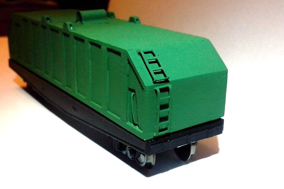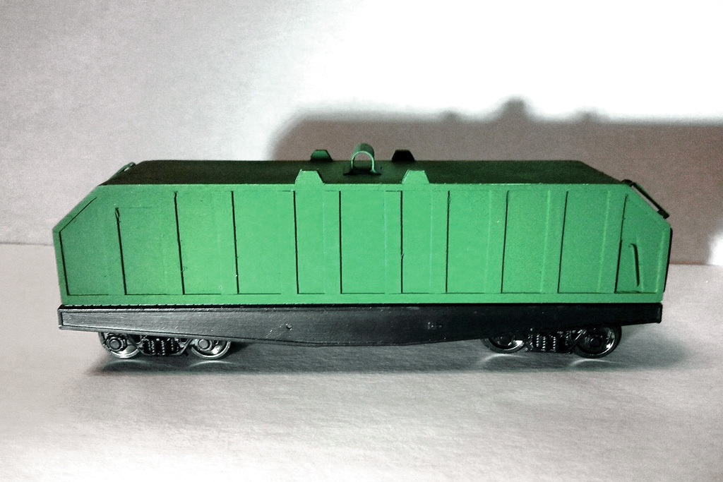 Разновидности: модель выполнена в единственном экземпляре Эпоха: V Принадлежность: РЖД Фирма-производитель: Дерунов В. Год начала производства: 2014 Описание моделиМодель крытого вагона для перевозки холоднокатанной стали изготовлена петербургским моделистом Владимиром Деруновым. Для изготовления модели использованы отдельные серийные детали производства фирмы "Пересвет" (основа - от модели 6-осной платформы немецких ж.д.; тележки). Колпак выполнен вручную из полистирола.
