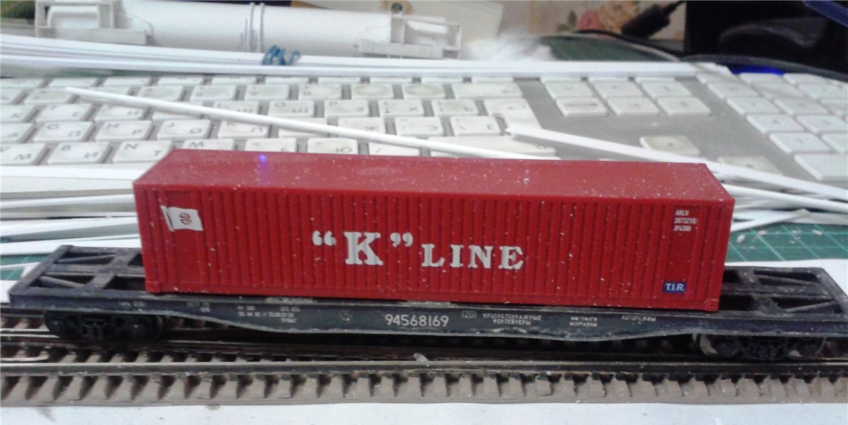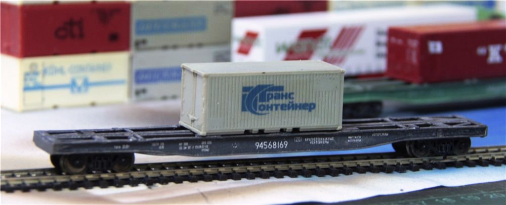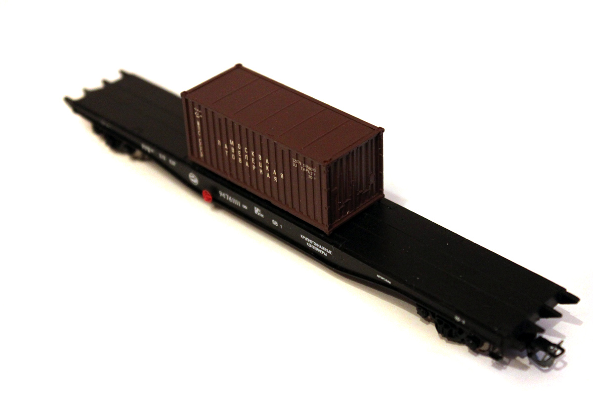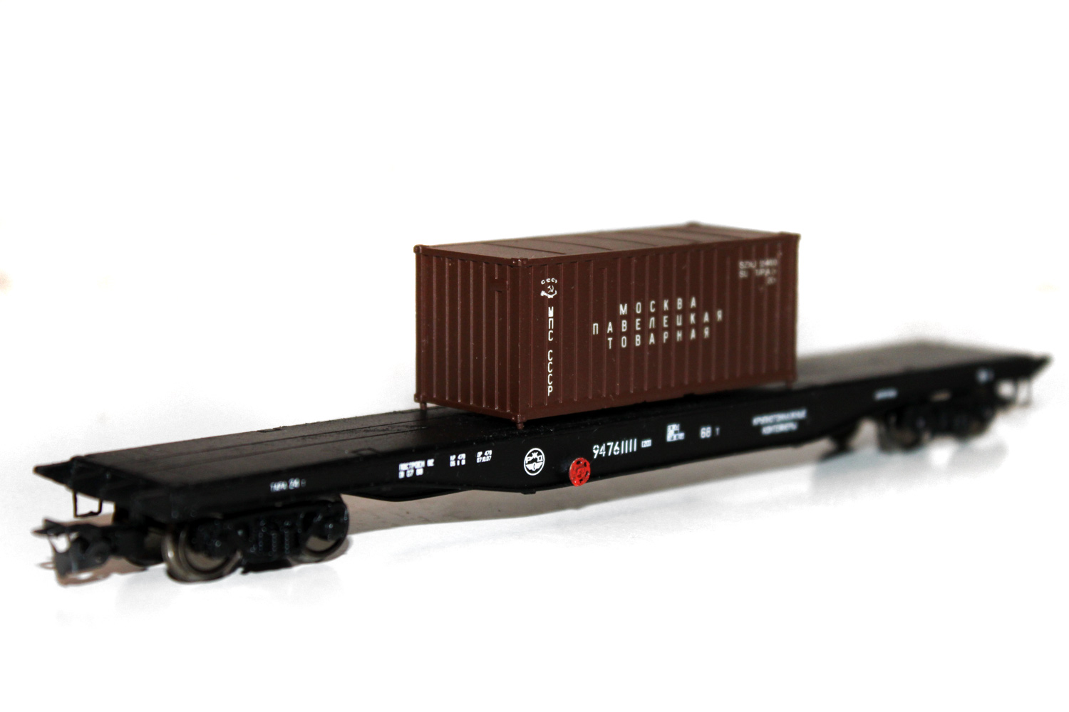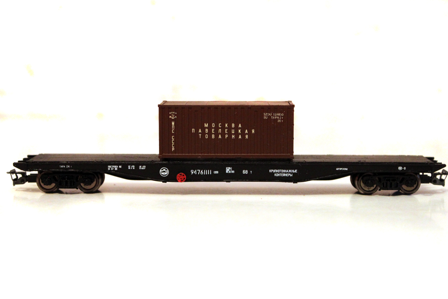 Разновидности: платформы с настилом и без настила; разные номера; окраска Эпоха: V Принадлежность: РЖД Фирма-производитель: Гладков В. Год начала производства: 2014 Описание моделиМодель удлинённой платформы - авторская работа московского моделиста Василия Гладкова, выполненная в виде неокрашенного корпуса (полистирол). Использованы отдельные серийные детали производства фирмы "Пересвет" (тележки, сцепные устройства,тормозное оборудование). Установка травленых деталей, окраска и номера выполнены Кириллом Виноградовым (СПб), в чьей коллекции и находится модель. Известен и другой вариант подобной платформы, отличающийся отсутствием настила. Другие модели подобных прототипов: - от "МоделисТТ" (малая серия); - от О.Балакина; - от К.Лукманова. Описание прототипаСовременная платформа увеличенной длины (мод. 13-9007) предназначена для перевозки трех 20-футовых контейнеров (или один 20-футовый + один 40-футовый). На платформе устаовлены 20 опрокидывающихся упоров для крепления контейнеровю Максимальная грузоподъёмность - 68 т, конструкционная скорость - 120 км/ч. Габарит 0-ВМ (01-Т). Производитель - ПО "Абаканвагонмаш".