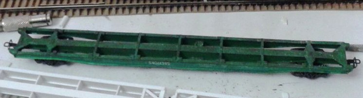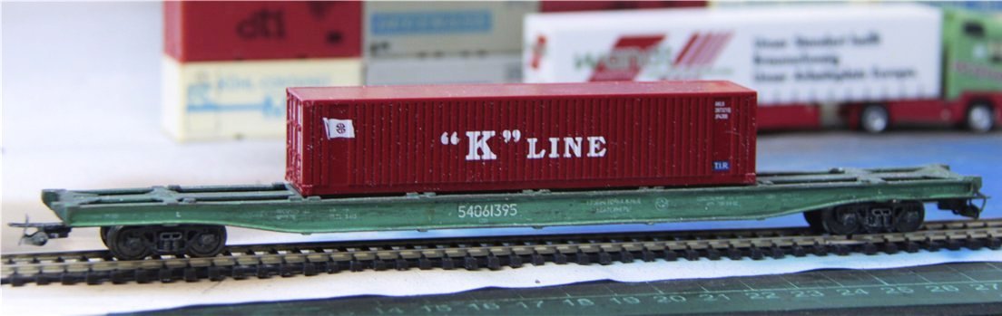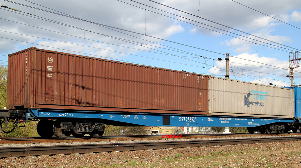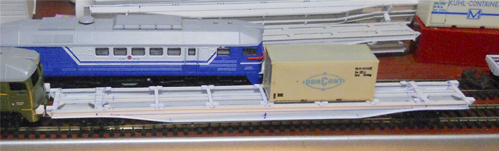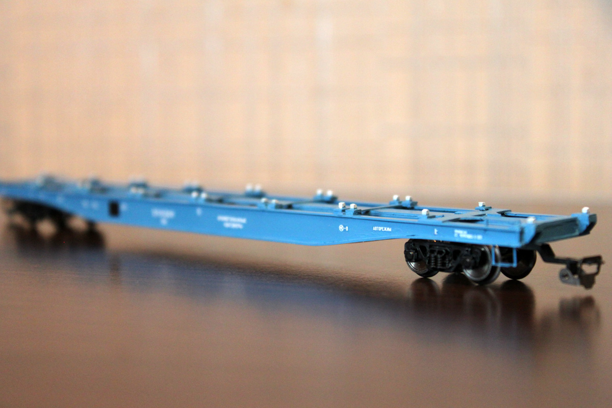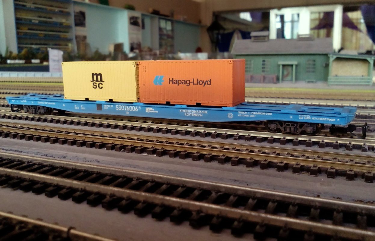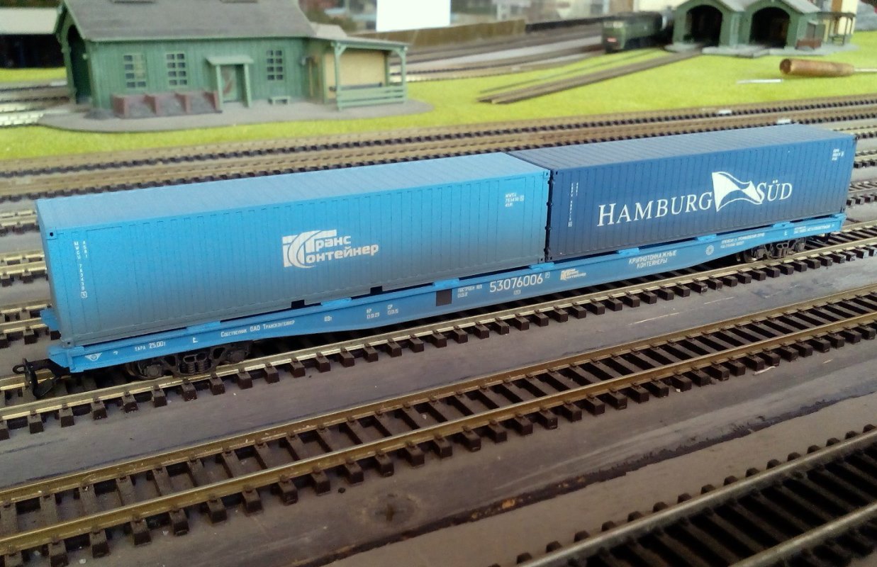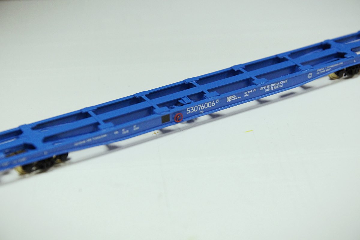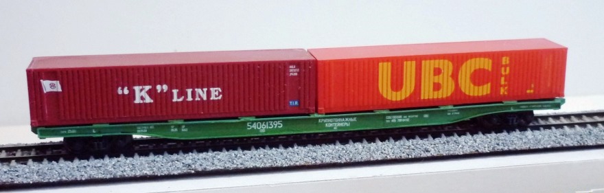 Разновидности: известно несколько авторских экземпляров, отличающихся окраской, номерами и деталями Эпоха: V-VI Принадлежность: РЖД, "ТрансКонтейнер" Фирма-производитель: Гладков В. Год начала производства: 2012-13 Описание моделиМодель удлинённой контейнерной платформы - авторская работа московского моделиста Василия Гладкова, выполненная в числе нескольких единиц (в виде неокрашенных корпусов или в черновой окраске). Материал корпуса - полистирол. Использованы отдельные серийные детали производства фирмы "Пересвет" (тележки, сцепные устройства,тормозное оборудование). Один из экземпляров модели доработан петербургским моделистом Кириллом Виноградовым (деталировка, включая травлёный "обвес", окраска, надписи). Другие модели этого прототипа: - от Мануфактуры "Норкин-Модель" (малая серия); - от В.Дерунова. Описание прототипаСовременная контейнерная платформа увеличенной длины (мод. 23-496-07) предназначена для перевозки двух 40-футовых контейнеров (другие варианты загрузки: четыре 20-футовых контейнера или два 20-футовых + один 40-футовый). Максимальная грузоподъёмность - 69 т, конструкционная скорость - 120 км/ч. Габарит 1-Т. Производитель - ОАО “Завод металлоконструкций”, г. Энгельс.