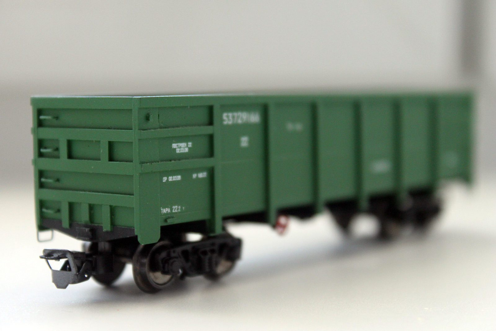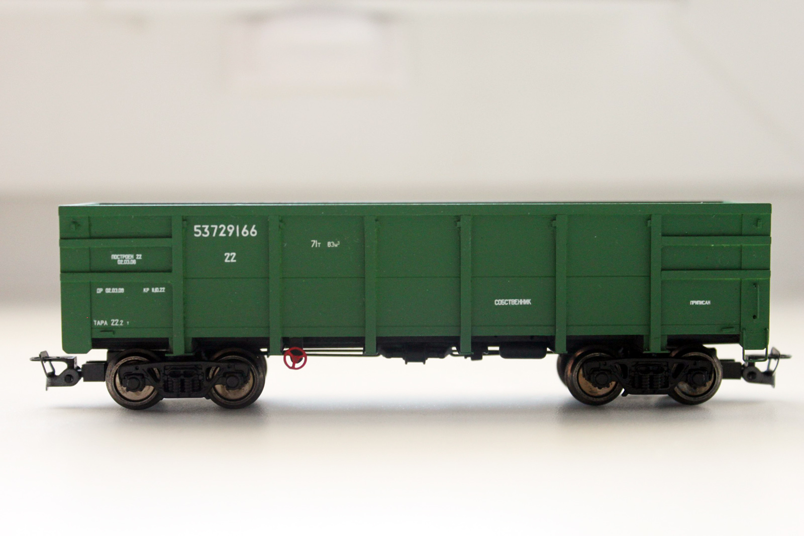 Разновидности: модель выполнена в единственном экземпляре Эпоха: V Фирма-производитель: Попов_С. (Москва) Год начала производства: 2015 Описание моделиМодель полувагона мод. 12-955 - авторская работа московского моделиста Сергея Попова. Корпус выполнен из пластика самостоятельно, использованы тележки ЦНИИ-Х3О и сцепки фимы "Пересвет". Окраска и надписи - К.Виноградов (СПб), в коллекции которого и находится модель. Впервые модель экспонировалась на традиционной выставке в ЦМЖТ, Санкт-Петербург, в марте 2016 г. Описание прототипаПолувагон мод. 12-955 производится Стахановским вагоностроительным заводом с 2004 г. Грузоподъемность - 71 т. Тара вагона - 23 т. Заявленный производителем срок службы вагона - 32 года.