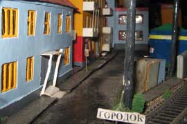 Тульский моделист и любитель транспорта, издатель журнала "Пантограф", создал на своих диорамах необычный мир. Это мир не столько железных дорог, сколько городского наземного транспорта. И всё же здесь - настоящее ТТ! И ещё одна "необычность" - почти все строения здесь сделаны руками автора, и поэтому можно при желании, вглядевшись в эти фотографии, ощутить не "аухагеновский", а вполне российский колорит! Всего есть 17 диорам, на которых расположены два государства и 16 населенных пунктов. Они делятся на два независимых друг от друга государственных образования: СРиД (Союз Райфланда и других земель) и Светлогорье, формально находящихся под одной унией (собственно обе страны имеют одного собственника, но политически независимы). В модельной сфере это заметно по, например, транспортной политике: так Светлогорье ориентируется 100 % на подвижной состав железных дорог СЖД-РЖД-СНГ, а СРиД – в этом плане «всеядный» - имеются как отечественный подвижной состав, так и иномарки, схожая политика присутствует и в формировании автомобильного парка, хотя здесь все менее жестко. Состав СРиД: Центральный округ: 1. г. Райфлянд (название произошло от первого, давно купленного здания вокзала). Приблизительные размеры 1х2 м. Существует и развивается с 1991 года. Транспорт: железная дорога, автобус, троллейбус. 2.пос. Д-Штадт, 1,1х0,5 м, существует с 1997 года. Сейчас находится в процессе удвоения территории и реконструкции. Транспорт: железная дорога (локомотивно-вагонное депо), автобус транзит. 3. д. Захаровка, небольшой населенный пункт, выросший на основе крошечного остатка старого макета А. Захарова (Москва), который был расширен, был построен жилой дом, модернизирована станция, травяной покров, насыпь, установлены заборы, стулья, стол и т.п. Станция однопутная. Новоградский округ: 1. г. Новоград-Карпатский. Создан в 2010 г. Транспорт: железная дорога, междугородний автобус. 2. с.Подзамковое. Создано в 2010 году. Транспорт автобус, железная дорога. 3. пос. Русинка. Построен в январе 2011 года. Транспорт железная дорога и транзитный автобус. Светлогорье: Светлогорский район: 1. г. Светлогорск. 1х2,5 м, существует с 2006 года. Транспорт: железная дорога, трамвай, троллейбус, автобус. 2. пос. Новое поселение. 0,5 х 0,5 м, существует с 2007 года. Транспорт: железная дорога, автобус транзит. 3. пос. Лучегорск и пос. Восточный. Созданы в 2010 году. Транспорт: железная дорога (станция Восточный), пригородный автобусный маршрут № 19. Дивногорский район: 1. пос. Дивногорск. восточная часть: 0,5 х 0,5 м, существует с 2008 года, западная на совместной диораме с Железнодорожным с весны 2009 года. Транспорт: железная дорога, автобус транзит. 2. пос. Железнодорожный. Существует с 2009 года, здесь находится управление железнодорожной компании «Светлогорская магистраль» и депо с небольшой ремонтной базой. Транспорт: пригородный автобус маршруты 12, 20, 21. 3. пос. Радужный. Существует с марта 2010 года, западный ворота Светлогорья, транспорт жд станция и автобус маршрута 21. 4. д. Бахметьево. Существует с осени 2009 года (большая часть, фрагмент с весны 2009 года), жд станция, автобус маршрута 12, 32. Городоцкий район: 1. г. Городок, 1х0,3 м, существует с 1997 года, заметно расширен и модернизирован в 2007 году. Транспорт: железная дорога и автобус. 2. пос. Городище. Существует на диораме с Бахметьево с осени 2009 года. Один жилой дом в саксонском стиле, и торговы