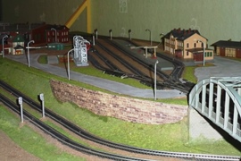 Задумка макета появилась в далеком 1986-м, когда наконец, в звании капитана, автор макета получил отдельную квартиру. Макет размером 240 х 120 см был построен монокаркасным. Каркас деревянный - брусок 40 х 40 и 30 х 30 мм, пропитан спиртовой морилкой. До сих пор дерево в отличном состоянии. Перекрытие из оргалита, да в то время ничего больше подходящего и не было. Фанера была бы тяжеловата. Макет прикреплен к стене комнаты и откидывается на двух шарнирах. Рельсовая схема - перехлеснутая восьмерка. Движение осуществляется по часовой стрелке. Общая длина рельсового пути около 20-25 м; установлено 19 стрелок, 12 светофоров. Когда праздновали дни рождения детей, поиграть на макете собиралась вся знакомая детвора. И никакого лимонада не надо было! Управляли втроём: двое на "кирпичах" (блоки питания типа Z1 кирпича) и один стрелочник - за пультом. Отработав таким образом 10 лет, с 1996 года макет был в консервации, пережил три переезда. Переезжал на "Волге" и таскался вручную по лестницам. И наконец в 2007 году нашел свое постоянное место. В 2010-м началась вторая жизнь макета - он был автоматизирован. Используется логика TTL, с жестким алгоритмом работы светофоров в зависимость от положения стрелок и занятости пути предыдущим поездом. В это же время на макете появляется веерное депо с поворотным кругом от Fleishmann ТТ. Е.Бычков