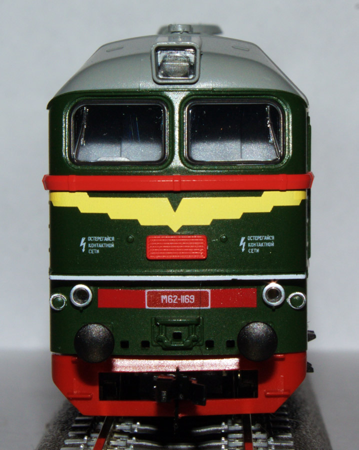 Разновидности: три разновидности (цвет - номера - деталировка) Эпоха: V Принадлежность: РЖД Фирма-производитель: Roco Год начала производства: 2010 Год окончания производства: производится по настоящее время Артикул: 36237 (зелёный с буферами), 36238 (сине-белый), 36276 (зелёный без буферов) Описание моделиМодель тепловоза М62 - первая серийная модель локомотива Российских жележных дорог, производимая австрийской фирмой ROCO. Модель появилась в мае 2010 г. сразу в двух разновидностях: М62-1169 в классической зелёной окраске и М62-1237 в бело-синей окраске прототипа, который работает с поездами Калининград-Берлин. Таким образом, этот вариант модели представляет собой совершенно тот же хорошо знакомый в Германии прототип, что и ранее производимая модель М62-1237 от фирмы Tillig. (Модель того же локомотива в варианте немецкой серии 120 и некоторых других экспортных вариантах выпускается фирмой ROCO с 2009 г.). Впоследствии зелёная модель арт. 36237 была снята с производства, взамен которой с начала 2014 г. начат выпуск нового варианта зелёной модели М62-1539 (арт. 36276 без декодера, 36277 - с декодером). На новой модели нет буферов и установлены характерные для отечественных ж.д. маты-"зимники" на боковых жалюзи. Крышевое оборудование новой зелёной модели повторяет крышу сине-белого М62-1237. Интересные факты: В моделях от ROCO устранены многие недостатки, которые характерны для модели М62 от Tillig (и, отчасти, для М62 производства "Пересвет", который использовал кузова от Tillig): - повышена визуальная копийность модели в отношении более правильной обводки лобовых стёкол кабины машиниста, а также более низкой посадки корпуса на тележки; - в зелёном варианте модели представлена форма крыши, "классическая" для М62 ранних выпусков (с двумя выхлопными трубами и без глушителя), привычная для отечественных ж.д., тогда как на модели М62-1237 - крыша с глушителем, характерная для локомотивов с номерами выше 1437 и для 2М62. Таким образом, номер 1237 на данный тип кузова нанесён неправомерно, а после КВР в 2006 г. с заменой дизеля на Д49 тепловоз 1237 получил глушитель уже нового образца (см. фото 3) и дополнительное крышевое оборудование между глушителем и холодильником; - на зелёной модели нанесены более масштабные и более полные технические надписи, лучше выполнены отдельные детали, в частности, прокрашены поручни, сделан интерьер машинной части, видимый в окна, модели наконец-то получили правильные ромбовидные заводские таблички. В то же время ряд несоответствий прототипу,свойственных модели от Tillig, сохранился и у ROCO, например: - на модели 1237 таблички "Берегись контактной сети" выполнены просто в виде белых прямоугольников, эмблема РЖД на левом борту сместилась на одно окно к холодильнику; - 4 тормозных цилиндра на тележках (экспортный вариант) вместо двух, характерных для локомотивов заказа МПС (правильный вариант представлен только на ходовке "Пересвета"); - на зелёной модели вентиляционная решётка на лобовой части кабины выполнена красной, а не серебристой (этот недостаток легко исправим, т.к. решётки представляют собой отдельные, хорошо отделяющиеся детали и могут быть без труда перекрашены); - отсутствие заднего красного огня (выполнено только переднее освещение, переключающееся при изменении направления движения); - не соответствующие прототипу стеклоочистители (у машин для МПС привода стеклоочистителей традицио