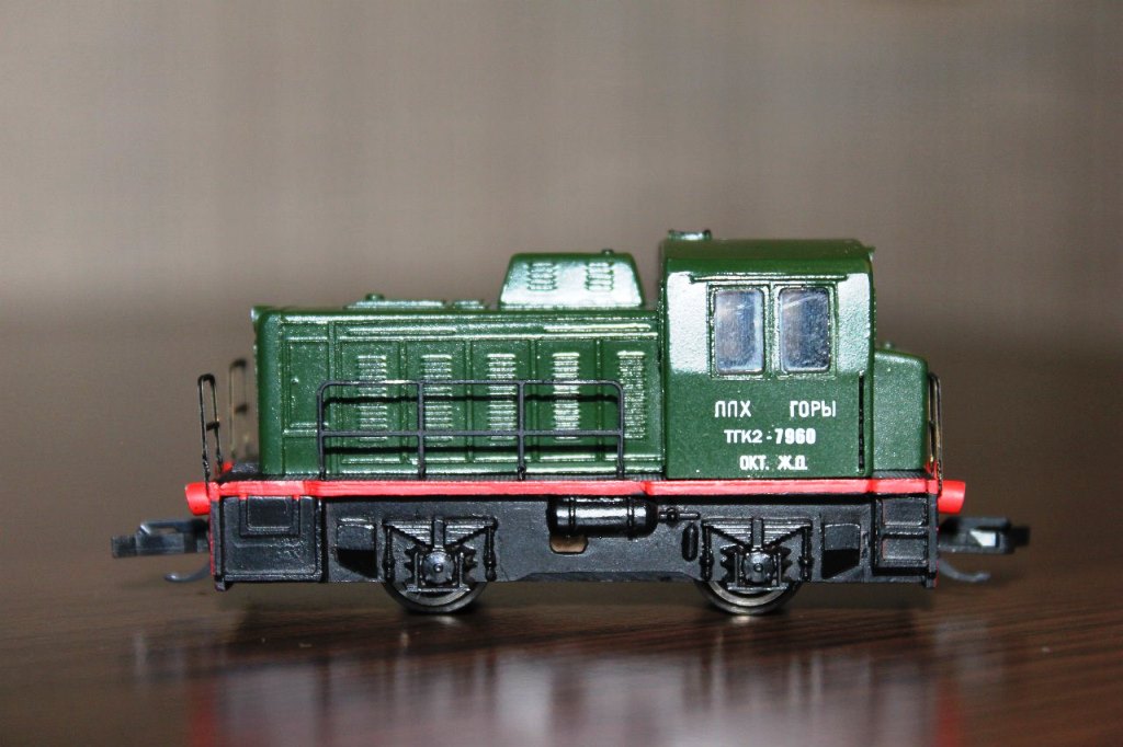 Эпоха: IV Принадлежность: не указана Фирма-производитель: Karsei Год начала производства: 2005 Год окончания производства: по настоящее время Описание моделиКорпус модели выполнен из эпоксидной смолы. Привод на обе оси. Пятиполюсный мотор небольшого размера обеспечивает хорошую тягу и создаёт эффект пустой кабины. Качество проработки деталей среднее; особенно неудачны передние лесенки. На модели только одна некачественно сделанная (смазанная) надпись: "ТГК2-7960" по обе стороны кабины. В комплект входит набор самоклеящихся сигнальных квадратов с чёрно-жёлтыми диагональными полосами, а также литник с металлическими накладными деталями чёрного цвета (поручни и др.). Согласно инструкци, для установки этих деталей необходимо просверлить два дестка отверстий диаметром 0,5 мм в металлическом корпусе модели. Освещение на модели не предусмотрено. Другие модели тепловоза ТГК2: - от А.Тишечкина. - от ПИКО. Описание прототипаПромышленный 2-осный тепловоз с гдропередачей ТГК-2 выпускался Калужским машиностроительным заводом. В период с 1962 по 1991 гг. было выпущено более 8000 локомотивов для промышленных предприятий (в т.ч. ТГК2э - экспортный вариантЮ который поставлялся: в ГДР - 183 шт., в ЧССР - 55 шт. и в Польшу). Локомотив развивает скорость 30 км/ч. На нём установлен дизель У1Д6-205ТК мощностью 185 кВт. Экспонируются в ряде железнодорожных музеев СНГ Новосибирска (ТГК2-8626), Ростова (ТГК2-6970), Бреста (ТГК2-149), Риги (ТГК2-5999), Ташкента (ТГК2-2245) и др.
