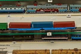 Эпоха: V Принадлежность: РЖД Фирма-производитель: Гладков В. Год начала производства: 2014 Описание моделиМодель сочленённой контейнерной платформы - авторская работа московского моделиста Василия Гладкова. Материал корпуса - полистирол. Использованы отдельные серийные детали производства фирмы "Пересвет" (тележки, сцепные устройства,тормозное оборудование). Описание прототипаСовременная платформа 13-470-01 для перевозки крупнотоннажных контейнеров представляет собой шестиосный вагон сочлененного типа. Изготавливается из двух платформ модели 13-470 с истекшим сроком службы. За счет оборудования устройством сочленения SAC-1, нестандартной конструкцией скользунов, поворотными турникетными опорами, вагон позволят перевозить три 40-футовых контейнера, один из которых установлен на турникетных опорах и перевозка которого производится над средней тележкой. Основные параметры: - погрузочная длина - 120 футов, - максимальная грузоподъёмность - 86,5 т, - габарит 1-Т, - срок службы - 32 года. Производитель: РМ Рейл (корпорация "Русские машины").