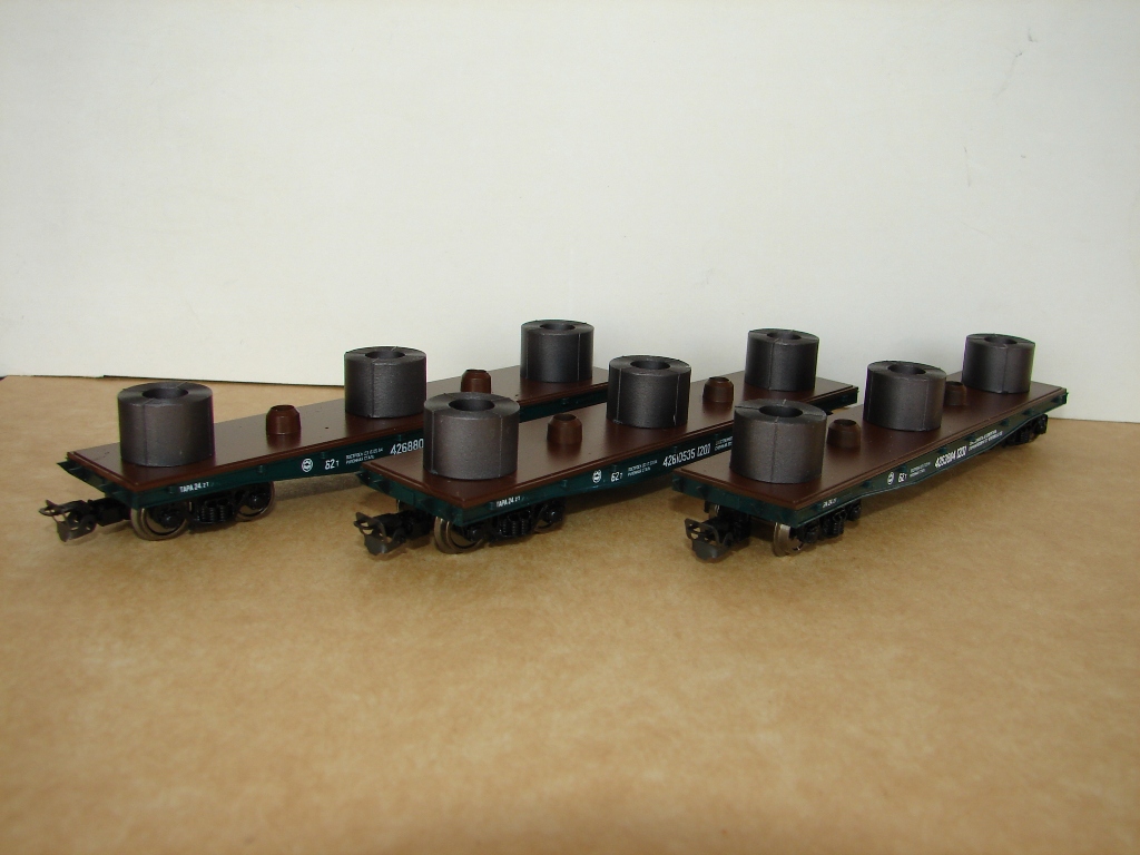 25-05-2020 Поступил в продажу набор вагонов для перевозки рулонной стали в окраске РЖД. Эта новинка была анонсирована "Пересветом" ещё в главном каталоге за 2016-2017 г.г., но выпущена только сейчас. Набор (Арт. 3807) состоит из трёх платформ с разными номерами, каждая платформа загружена тремя рулонами стали. Для полной загрузки платформ можно использовать поставляемые отдельно рулоны (Арт. 5614).